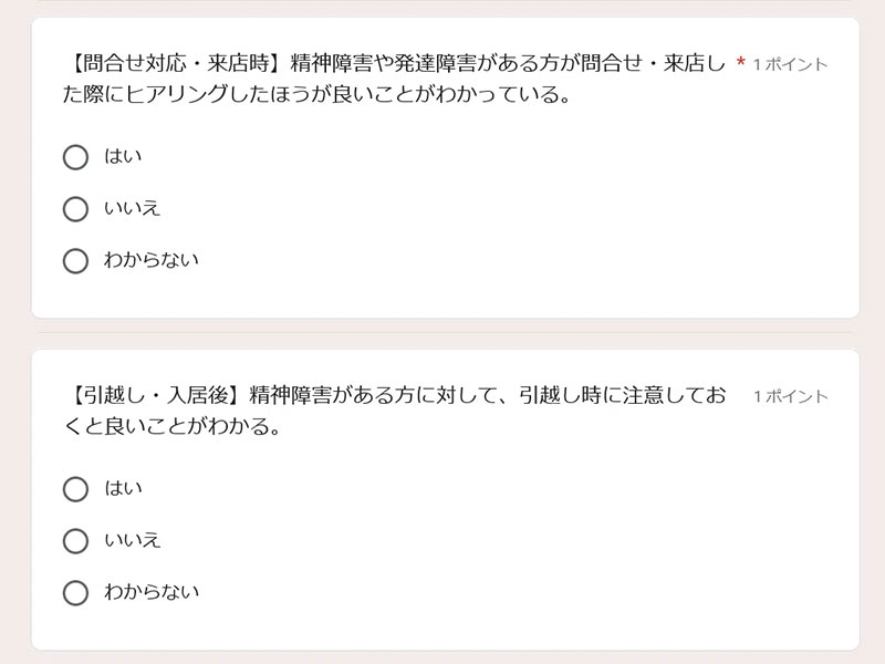 共通の基礎知識から4問、知的障害の基礎知識から3問、知的障害のお客様に対する問合せ対応・来店・内見・申し込み・契約から3問、精神・発達障害のお客様に対する引越し・入居後対応、特記事項から3問の、計13問で構成されている。目標得点は10点以上だ。