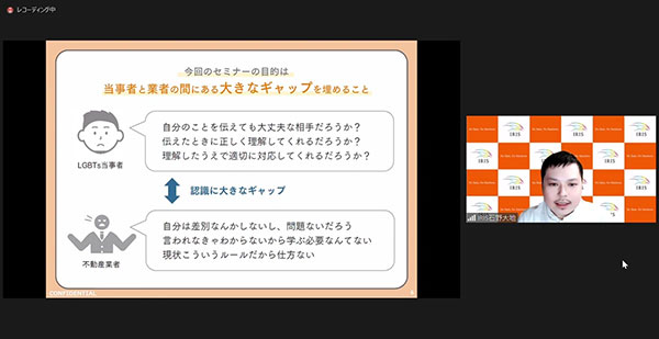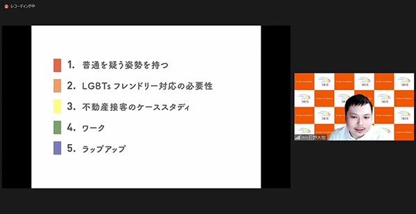 セミナー後半では、「普通を疑う姿勢を持つ」「LGBTsフレンドリー対応の必要性」「不動産接客のケーススタディ」「ワーク」の4つを軸にして話が進んだ。