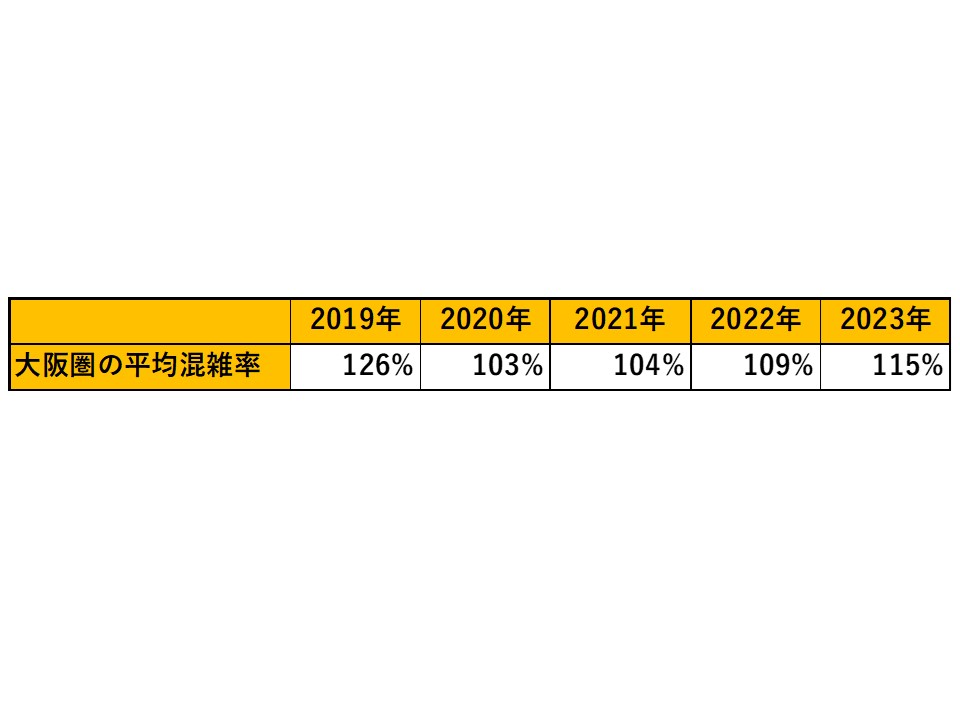 国土交通省では、通勤通学時間帯の鉄道の混雑状況を把握するため毎年「都市鉄道の混雑率調査」を行っている。東京圏においては主要31区間、大阪圏においては主要20区間、名古屋圏においては主要8区間の平均混雑率を公表している。大阪圏の場合、コロナ禍に入った2020年度から2021年度は、126%から103%とがくんと下がっているが、2023年度に入ると115%まで上昇していることがわかる。