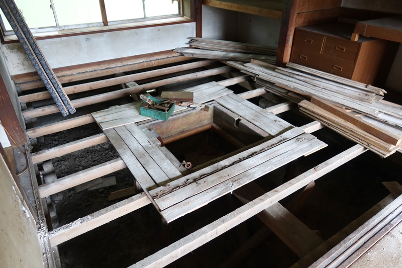 すでに入居者のいる室内は改装中で、DIYの経験のない人には廃墟のように見えるかもしれないが、躯体はしっかりしているので作るのは内部だけで良い。室内を見せていただいた面白かったのは基礎。80センチほどと高くなっており、どうやらそれが建物の状態を良好に保っていたらしい。