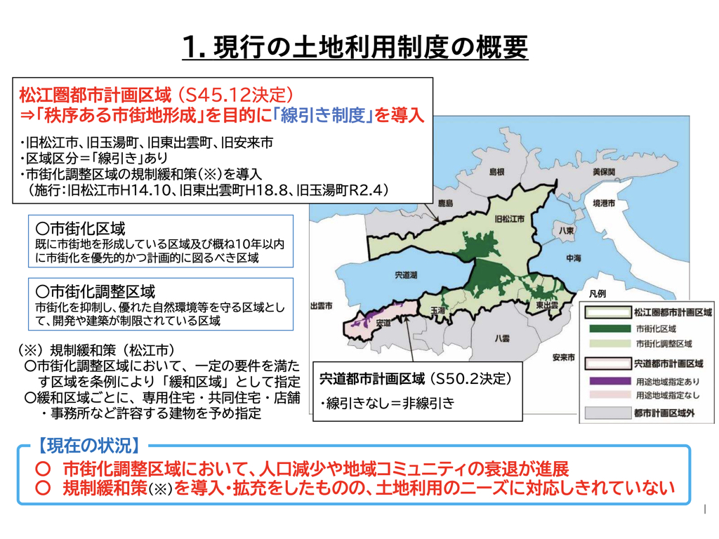 松江市は、安来市と一体となって県内最大の松江圏都市計画区域(18.8万人、うち松江市16.2万人)を形成しているが、新規の建築・開発ニーズがありながら市街化区域内に適地がない状況を踏まえ、線引き廃止の方針を2023年に表明した。