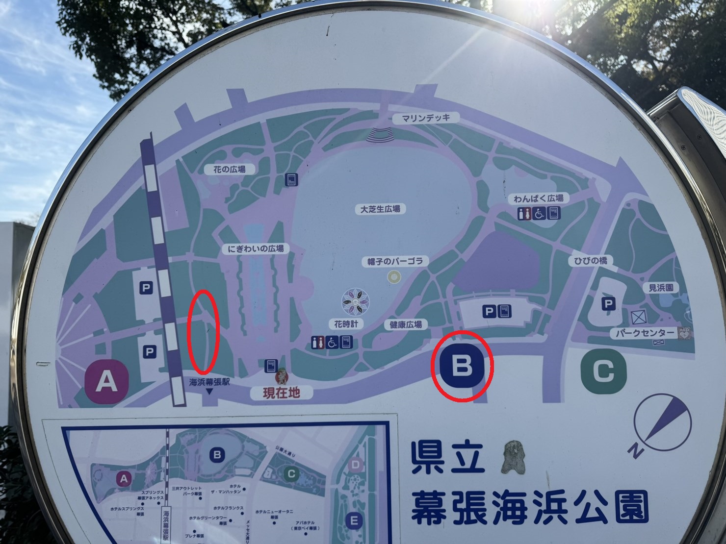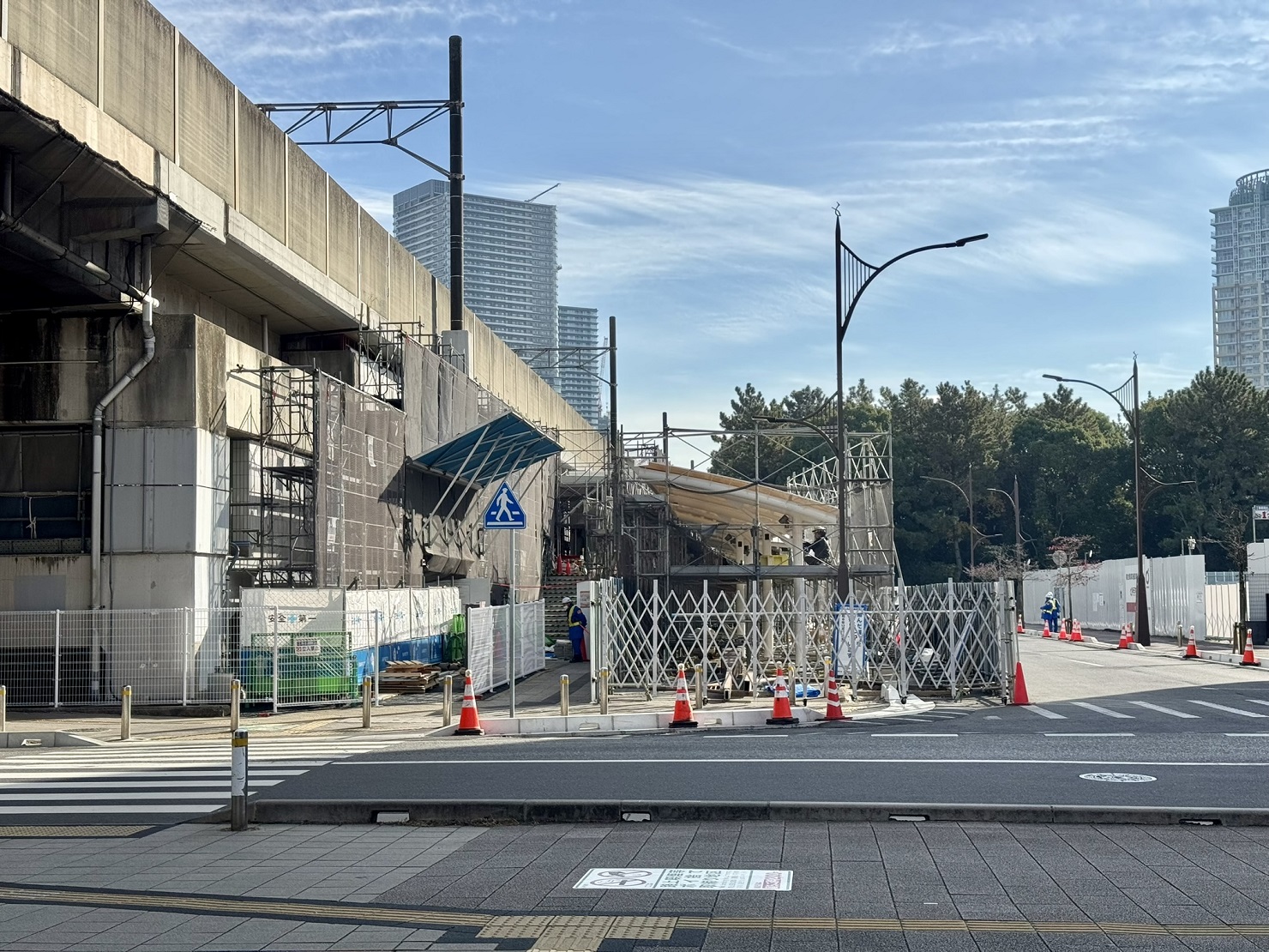 2024年12月、再整備するエリアの様子をJR海浜幕張駅から幕張海浜公園まで歩いて見てきた。まず新改札口については、現在の駅舎の蘇我方面で工事が行われていた。ちょうど駐輪場の上の部分だ。そこから道路(公園中通り)を渡った場所が幕張海浜公園になるので、そちら側に住む人たちにとってはかなり利便性が向上するはずだ。