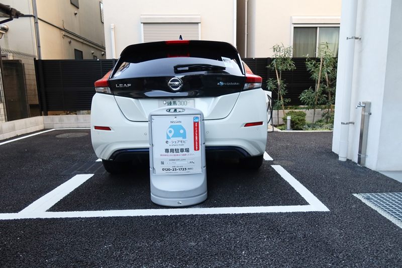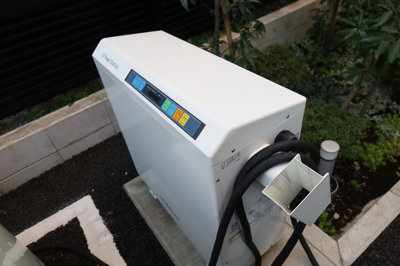 備蓄以外では非常用電源も備えられている。太陽光発電設備、蓄電池は一般的だが、ひとつ、なるほどと思ったのはEV車のカーシェア。敷地内に1台配備されているのだが、この車、平常時には普通に車としてシェアして使い、入居者の利便性に寄与するが、災害時には大きな蓄電池となる。EV車駐車場にV2H(Vehicle to Home)、つまりEV車から家庭に電力を供給できる設備が導入されているのだ。