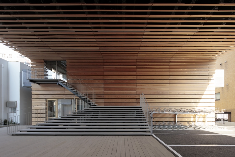 木材を多用しているのも、デザイン面での配慮に加えて木材による炭素貯蔵の効果を期待してのこと。建物全体では杉の木に換算して約200本分、約152tの炭酸ガス貯蔵ができる計算となっているそうだ。
