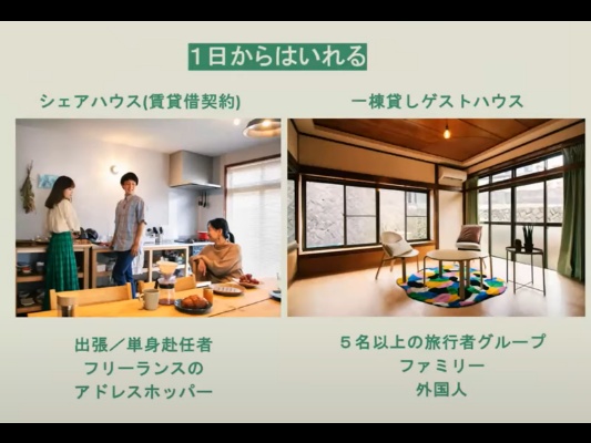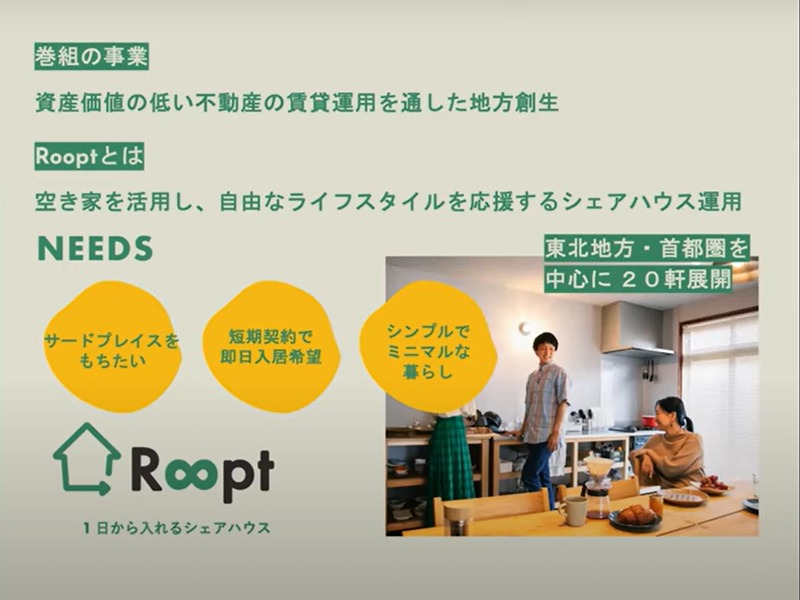主力商品は、空き家を活用したシェアハウス「Roopt(ループト)」。Rooptは都心と地方を行き来し自由なライフスタイルを送る人たちに向けたシェアハウスで、1日から入居可能だ。