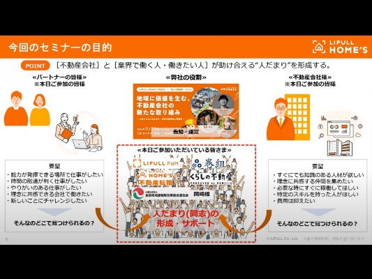 同セミナーの目的は「不動産会社と業界で働く人・働きたい人」が助け合える“人だまり(同志)”を形成すること。