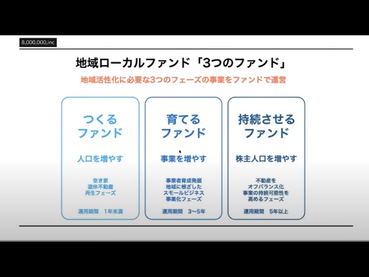 さまざまな取り組みを行う同社だが、やはり1社で行うには限界があると島田さんは言う。そこで地域に関わる多くのステークホルダーが参加できる「つくる・育てる・持続させる」3つのファンドをつくった。