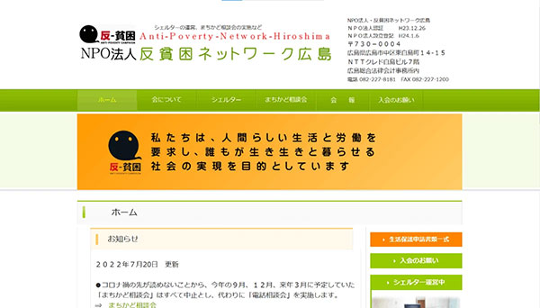 NPO法人 反貧困ネットワーク広島は、広島県広島市を中心に活動する団体で、2009年1月に設立された。「今の社会から貧困をなくそう」をモットーに、問題に取り組んでいる。
