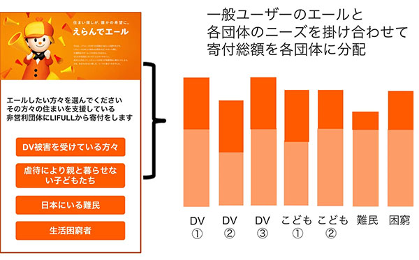 「えらんでエール」とは、LIFULL HOME’Sを利用する方々に支援先を選んでもらい、ユーザーに代わって寄付を行うものだ。