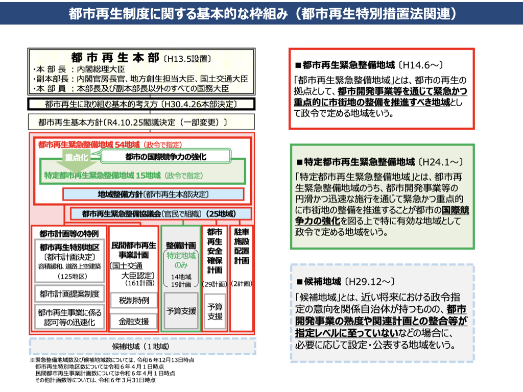 都市再生緊急整備地域は、2002年に制定された都市再生特別措置法に規定されている。同法については、近年、日本の人口減少に伴ってコンパクトシティ政策(立地適正化計画制度)が注目されているが、法制定時は、主に大都市の都市再生に主眼が置かれていた。