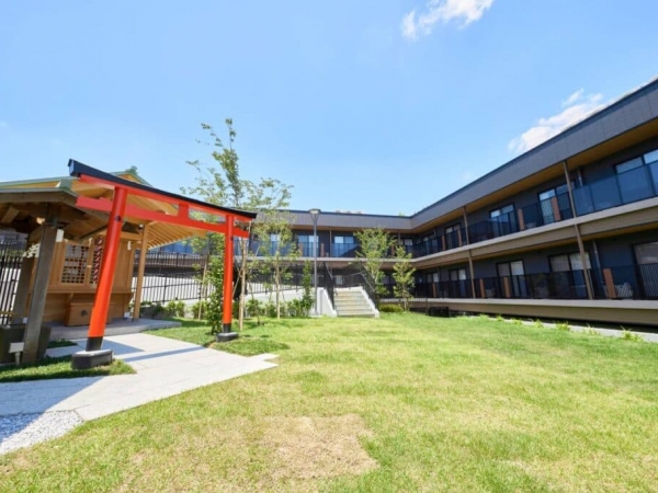 このホームの驚く点は、神社の敷地内に建設されたことだ。つまり神社と施設が一つの土地の中に共存しているということだ。