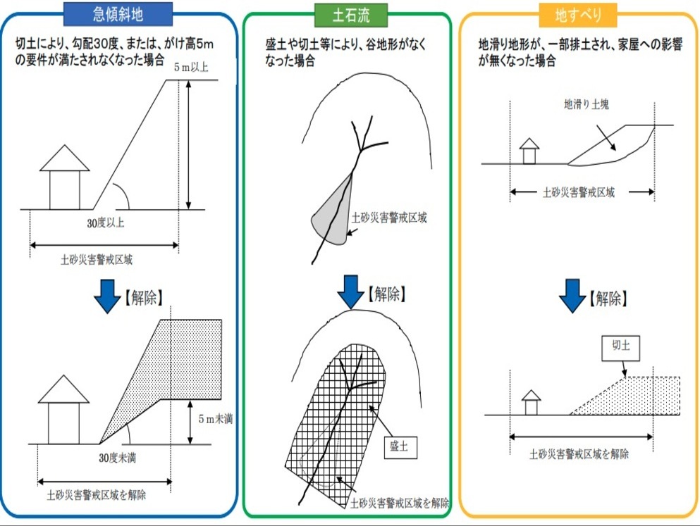 ・盛土や切土等により地形的条件が改変され、指定の条件を満たさなくなった場合には土砂災害警戒区域を解除する。