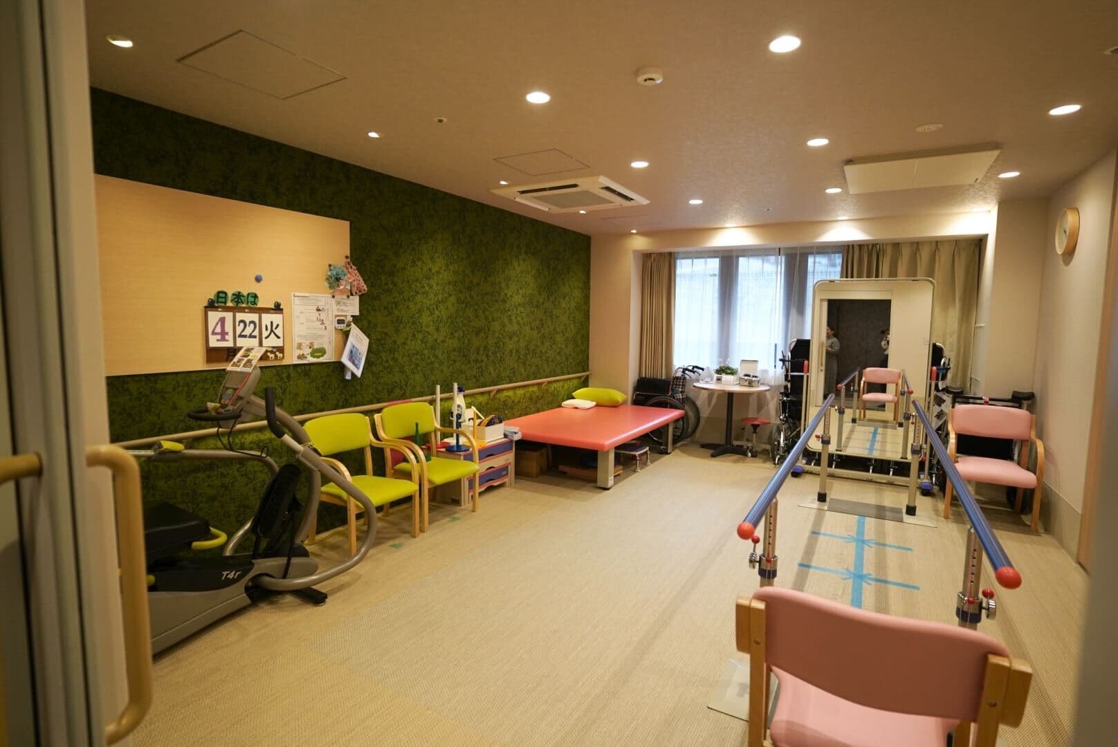 その他共有スペースとして、機能訓練室やダイニングスペースがある。浴室は個浴・機械浴の2種類。自立して入浴可能な人は個浴室スペースを順番で利用し、介助を必要とする人は機械浴を利用する。