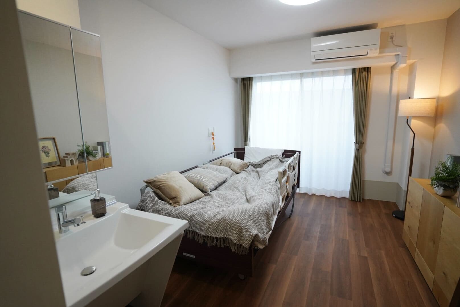 2023(令和5)年7月、大田区に開設された「アズハイム大田中央」は介護大手の株式会社アズパートナーズが運営する介護付き有料ホーム(以下ホームとする)で、原則65歳以上の要支援および要介護1〜5の認定を受けた人のみが入居できる。ホームは3階建てで、居室は全71室。各部屋は完全個室で11畳ほどのスペースがあり、室内にはトイレ、洗面スペース、クローゼットと介護ベッド、エアコンなどが備え付けられている。家具類は持ち込みが必要だ。1階はある程度自立して生活ができる人のためのフロアとし、2階以上はより看護を必要とする人たちが暮らすフロアとゾーンをわけている。