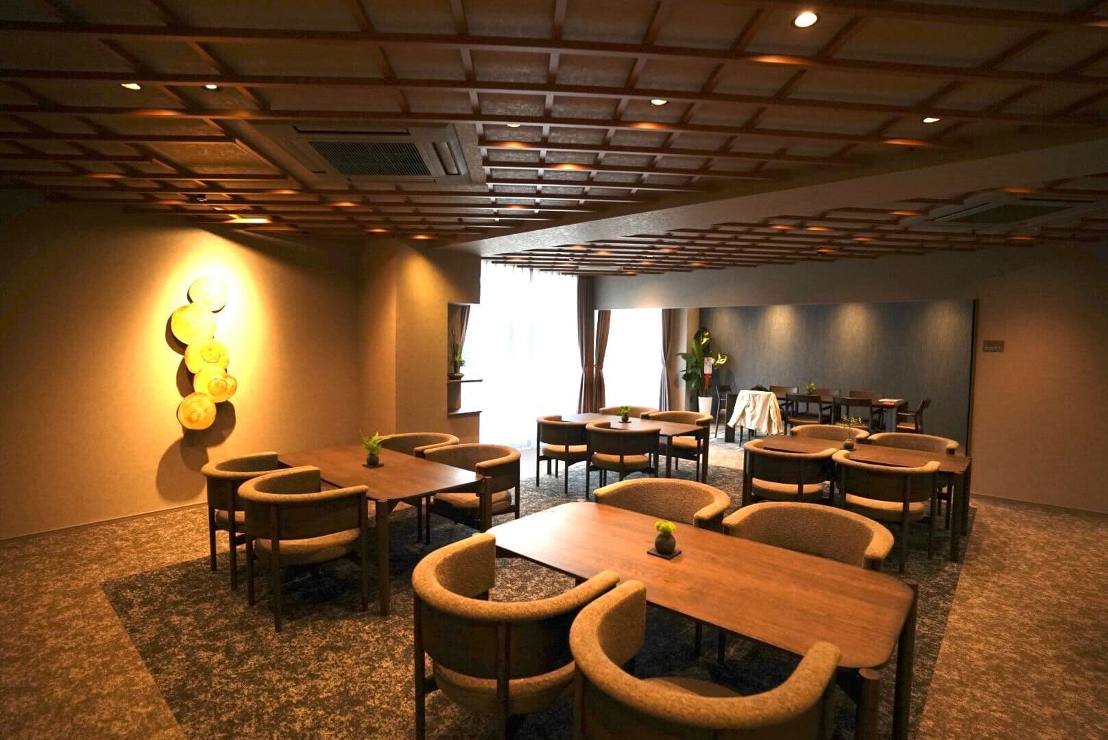 たとえばホームのエントランスを入るとすぐある受付には大きな木のカウンターが存在する。またレストスペースには美しい木の年輪や風合いが感じられるオブジェの姿も。これは、神社にあったご神木を用いてデザインしたものだ。エントランスホールから望むことができる小さな庭園には、神社の擁壁で使用していた大谷石の姿も見られる。