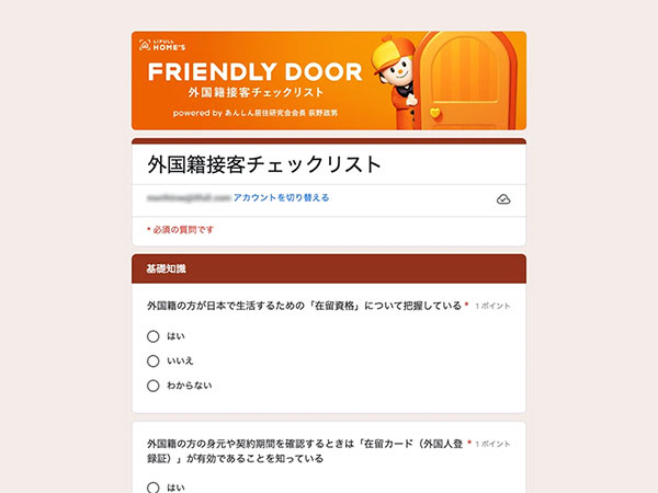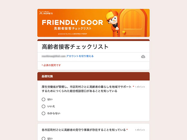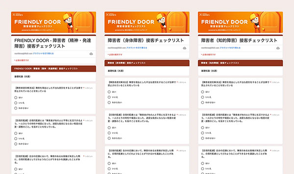 住宅弱者に「フレンドリー」な接客とはどのようなものだろうか。定義は難しいが、フレンドリーの意思表示だけにとどまらないように、FRIENDLY DOORでは、各カテゴリーで求められる接客をテスト形式で学ぶことのできる「接客チェックリスト」を不動産会社向けに提供している。