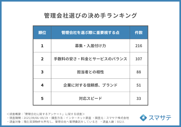 スマサテ株式会社が公開した「管理会社選びの決め手ランキング」(調査人数:552人)によれば、賃貸不動産オーナーが管理会社を選定する際に最も重視している要素は「募集・入居付け力」であることが明らかになった。全体の約4割にあたるオーナーがこの点を第一の決め手として挙げており、いかに物件の稼働率を重視しているかがよくわかる。