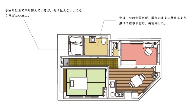 リノベーションでは建築家に依頼、設計してもらうことが多いが、同物件では建築家も含めて様々な職業の人に依頼。それぞれの人が部屋のコンセプトを決めたり、人によっては自分で施工したりして全室が異なる部屋になっている。十人十色という言葉があるが、例えれば十三室十三色ということである。