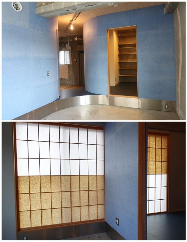 特徴は壁に貼られた顔料を混ぜ込んで作られた青い和紙。穏やかな青のアールの壁の向こうには白と茶、2色の障子が見える和紙三昧の部屋で、部屋の形状は斬新だが和を感じる。他の部屋よりも空間が明確に分けられているのも特徴で、SOHO使いが意識されている。