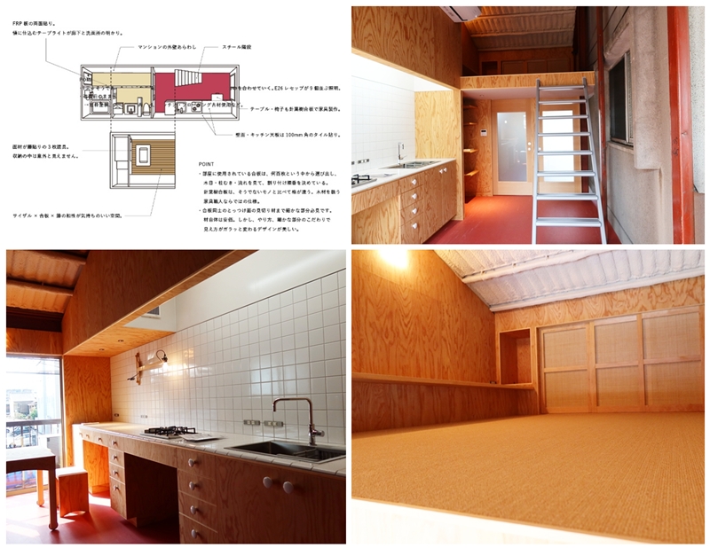 さらに窓際に設置された障子、キッチンとなりの居室の壁も10度傾いており、部屋に入ると一瞬空間が歪んで見える。また、室内に躯体現し部分、障子、板金、ラワン合板とさまざまな素材が使われているのでコンパクトな空間が豊かに感じられるのも特徴。エアコンや冷蔵庫、レンジフードが見えないように配されているのは使い方を考慮した結果である。