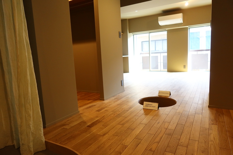 「文章を書くための部屋」を意図して水回り以外を大きなワンルームにした部屋では住戸中央にある穴がなにより驚き。鉢植えやアートを置いて使うことを意図したそうで、覗くと土の上に水が溜まっているような作り。穴の底にはモルタルを土色に染めてひび割れのある左官仕上げにしたものが敷かれており、その上にレジンが流されているのだ。
