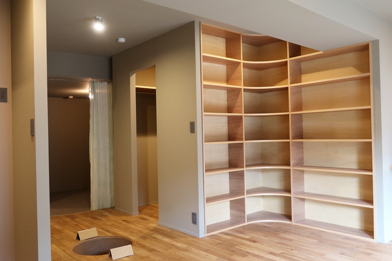 取材の時点ですでに申し込みが入っていたのが403(専有面積42.84m2)の和紙職人であり、各種アート作品、内装なども手がけるハタノワタルさんによる入ったところに広い土間のある2K。一段上がったところに緩くカーブをする壁で仕切られた水回り、寝室とキッチンがあり、その2つの空間の間にもうひとつ、何にでも使えそうな小部屋が配されている。