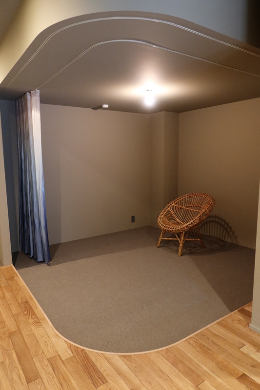 カーテンは和紙で作られた森をイメージさせたもの、裾に行くほど色が濃くなる湖をイメージしたものの2種類で、どちらの色合いも非常に美しい。布類を間仕切りの材として使うのはこれから流行りそう。