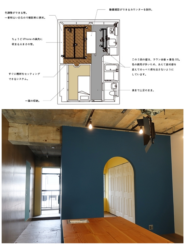 具体的には動画撮影時に使えるカウンターがあり、その上の天井部分には機材がセットできるようになっているというもの。スペース自体が動画撮影に使う画角を意識したサイズになってもいる。動画撮影を意識した部屋は見たことはあるものの、ここまで徹底しているのは珍しいのではなかろうか。玄関側には居室として使える壁面全体に収納を設けた部屋も作られている。