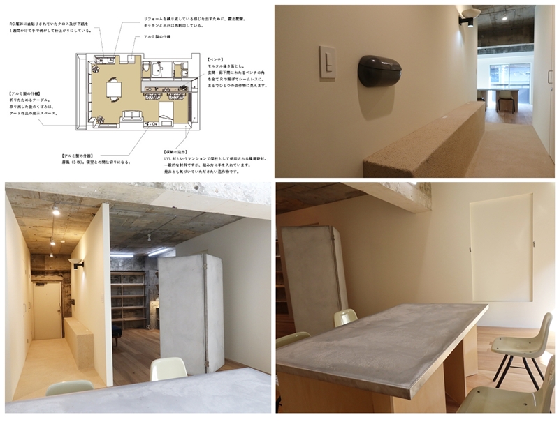 202(専有面積47.13m2 賃料11万5000円)を手掛けたのは履物職人であり、ギャラリーオーナーであるAA関塚さん。玄関から伸びるベンチのある廊下はモルタル掻き落とし。調べてみるとこれは一般的には外壁、デザインウォールなどで使われる技法で、その技術を使ってここでは玄関と廊下、ベンチが一体的に作られている。向かいに風呂があるので風呂上りに裸足で歩くと気持ち良さそうだ。