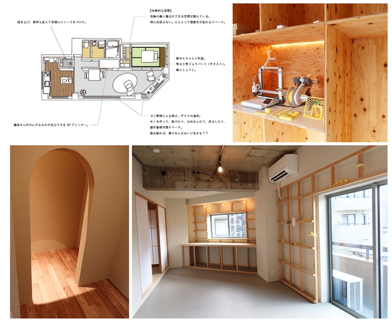 面白さという意味ではムダヅクリコンテンツクリエイターの藤原麻里菜さんの藤原さんが不定期に送ってくるプログラムによってムダなものが出力できる3Dプリンターが設置された301(専有面積53.35m2 賃料12万円)も良かった。壁際に産出したムダな作品をディスプレイできるたくさんの棚が用意されているのに加え、和室収納の奥には儀式部屋と名付けられた謎の小部屋がある。写真が撮りにくいほどのサイズの極小空間で籠って座禅するもよし、懺悔するもよし、誰かを閉じ込めるもよし、いろいろに使えそうだ。