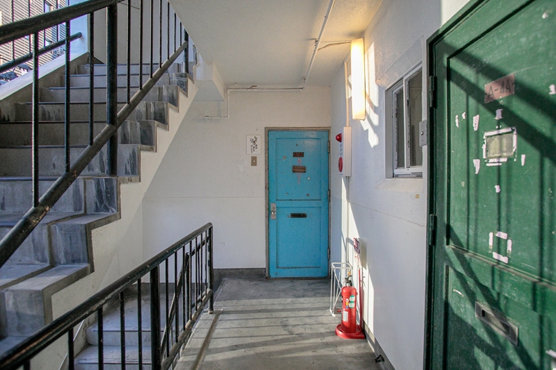 続いては静岡市営羽衣団地(2棟、4階建て、全48戸)。同団地も魚の町団地と同じ48型だが、竣工は1949年3月で魚の町団地よりちょっと先輩。48型のうちでも最高齢である。この団地が他と異なるのは戦後の住宅不足の解消、生活水準の向上、市内事業者の育成などといった他の団地同様の意図に加え、住宅で防火帯を作ろうという意図があったこと。