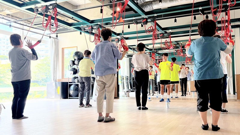 前者の銀行跡地は介護と交流のラウンジ、竹山セントラルとして整備され、中心となっているのはレッドコードという器具を使った介護予防体操。椅子に座るなどしてコードを使って体を動かすというもので、安定した姿勢で安全に運動することができるのが特徴。専門家の指導を受けたサッカー部の部員たちがインストラクターとして現場を回しており、学生たちにとっては住まいの近くでできるアルバイトという意味もある。団地にとっては以前からの課題であった健康、孤立に自然な形でアプローチする場である。