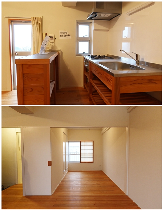 また、DIYできる部屋もほぼ既存のままで主に内装に手軽に手を入れられるプランとキッチン、洗面や床の仕上げなども自分でやる本格的なプランを用意(現在は、取り扱いしていません)、選択できるようにした。高齢化に伴って空室が目立つようになっていた4階、5階の賃料を安めに設定、上階から埋めるようにしたのも工夫だった。賃料はそれまで3万円をきっていた部屋を3万円ちょっとに値上げ。取材では上階にお邪魔したが、眺望が良く、中には海が望める住棟もある。