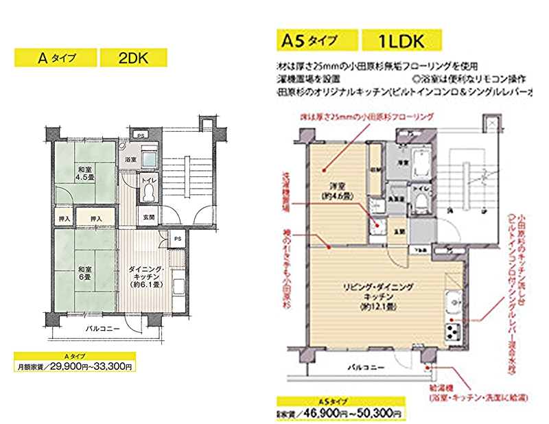 次に住戸について。ここでは入居率の改善のため、2つのリノベーションが行われている。それによって団地の魅力を向上させ、入居を促進させようというわけだ。ひとつ目のリノベーションは住戸そのものの改修。もともとの間取りは和室6畳、4.5畳にDK約6畳の2DK、専有面積は36~37m2前後。それをあらかじめ改修された複数の住戸プランから選ぶセレクトリノベーション、自分でDIYできるセルフリノベーションの2つから選べるようにしたのである。