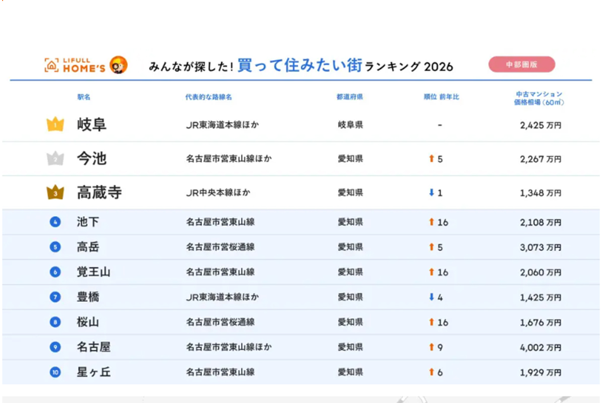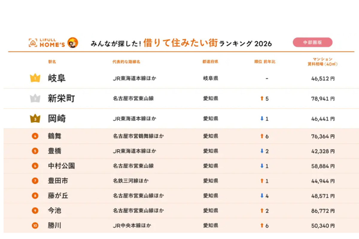 そこで今回のレポートでは、2026年2月に発表された「<中部圏版> 2026年 LIFULL HOME'S みんなが探した!住みたい街ランキング」を参考にしながら、トップ10ランキング圏外から、今後ダイヤの原石となるかもしれない“のびしろが期待できる街”を選んでみた。