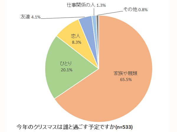 まず今年のクリスマスを誰と過ごす予定か聞いてみたところ、「家族や親類」と過ごすと回答した方が最も多く65.5%、次いで「ひとり」との回答が20.1%、「恋人」「友達」「仕事関係の人」「その他」と続いた。「その他」の回答として、「ペット」(30代女性)との回答もあった。