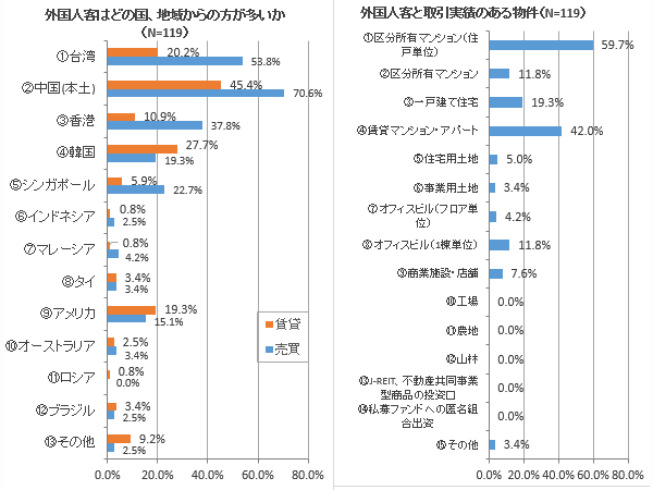 売買では「中国」(本土)が70.6%で最多となっており、次いで「台湾」が53.8%、「香港」が37.8%、「シンガポール」が22.7%、「韓国」が19.3%となっている。賃貸では「中国(本土)」が45.4%、「韓国」が27.7%、「台湾」が 20.2%となるなど、売買、賃貸共にアジアの各国が上位に並んでおり、同じアジア圏でも中国(本土)、台湾、香港、韓国といった東アジアとその他アジアとの間に差が生じている。