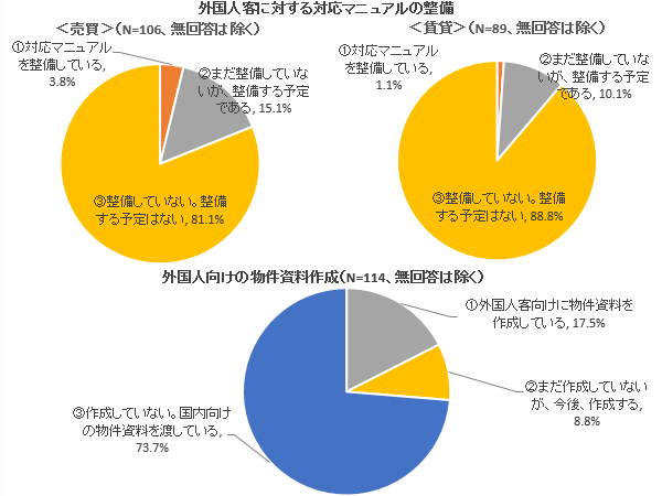 外国語の契約書については、「作成している」が売買で8.5%、賃貸で10.4%、外国人向けのマニュアルを「整備している」と回答したのは売買で3.8%、賃貸で1.1%にとどまっている。
