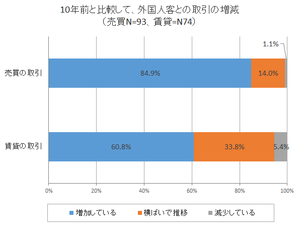 また、10年前と比べて外国人との売買取引が「増加した」と回答したのは84.9%を占めており、「減少している」は、わずか 1.1%とという結果になった。また、賃貸でも「増加している」が 60.8%と大半を占めており、「減少している」は売買よりは多いものの5.4%に留まる結果となっている。