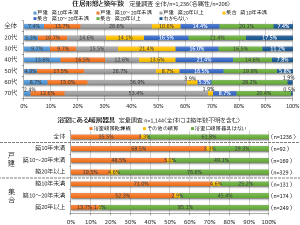 住宅設備については、戸建住宅・集合住宅ともに築年数が浅いほど浴室や脱衣室に暖房器具が設置されていると答えた人の割合が高かった。築10年未満では約7割が設置、築20年以上の住宅では約8割が設置されていない状況である。
