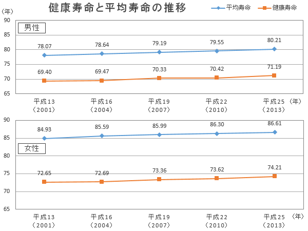 平均寿命の延びと同じく気にかかるのが、健康寿命、いわゆる健康上の問題で日常生活が制限されることなく生活できる期間である。2013年時点の男性の平均寿命は80.21年、健康寿命は71.19年で、女性の平均寿命は86.61年、健康寿命は74.21年である。平均寿命の延びに対し健康寿命は、やや延びが小さい傾向にある。2013年の平均寿命と健康寿命の差を見ると、男性は9.02年、女性は12.4年であり、健康上の問題などにより日常生活に制限のある期間であると考えられる。