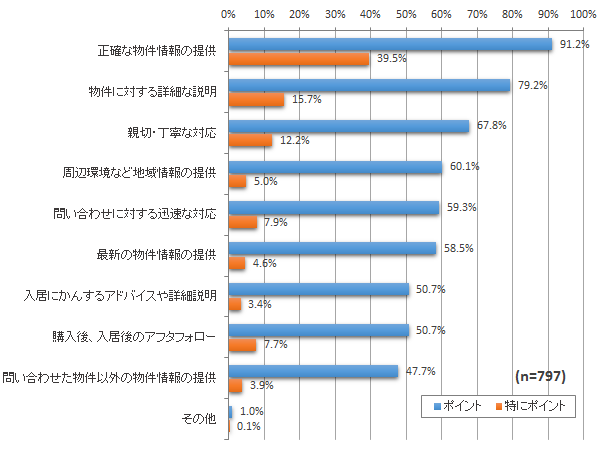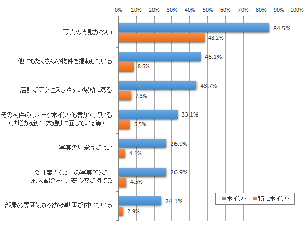 不動産会社を選ぶポイントとしては、「写真の点数が多い」が売買(67.8%)、賃貸(83.9%)共にもっとも高い割合を占めており、賃貸物件を調べるユーザーの48.2%が「特にポイントとなるもの」として挙げている。インターネット上でいかに自分が住もうとする物件のイメージを描くことができるかという点が重要なポイントであることがわかる。