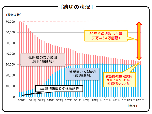 昭和36年には全国に約7万ケ所あった踏切だが、立体交差化やアンダーパス化などが進められ、平成26年の時点では約3万4,000ケ所とこの50年で半減しており、遮断器のない第3、4種踏切については約1割にまで減少している。