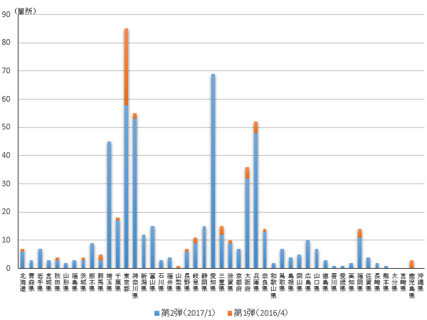 第1弾と第2弾を合わせた都道府県別の指定数では、東京都が85ケ所と最も多く、次いで愛知県の69ケ所、神奈川県55ケ所、兵庫県52ケ所、埼玉県45ケ所が続いており、開かずの踏切が都市部に集中していることがはっきりとわかる。