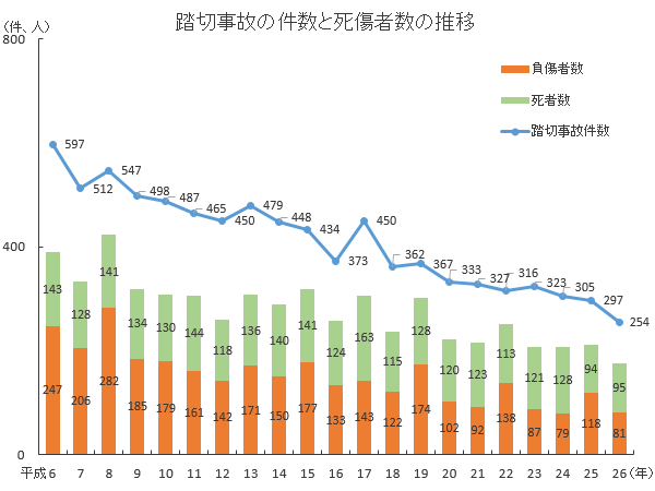 まずは、踏切道改良促進法が起案される要因ともなった踏切事故の発生。多数の人が乗車する鉄道の事故による影響は非常に大きいといえる。踏切事故の件数は、年々減少傾向にあるものの依然、1日1件のペースで発生しており、死亡事故については4日に1件のペースで発生している。このうちの約4割が65歳以上の高齢者である。さらに、開かずの踏切では、通常の踏切よりも事故発生の割合が4倍に跳ね上がっている。