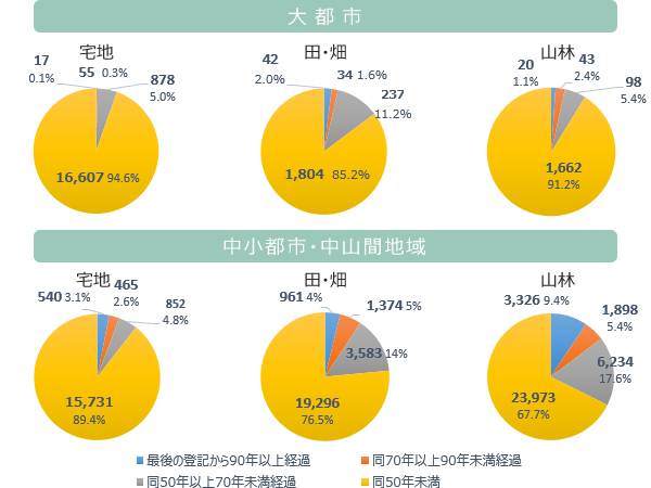 所有者不明になっている可能性がある土地のうち、最後の登記から50年以上が経過している内訳をそれぞれ見てみると、大都市では宅地が950個(5.4%)、田・畑が313個(14.8%)、山林が161個(8.9%)となっている一方で、中小都市・中山間地域では、宅地が1,857個(10.5%)、田・畑が5,918個(23.4%)、山林が11,458個(32.4%)と、都市部に比べて50年以上の長期間、登記の変更がされていない土地が多い結果となっている。
