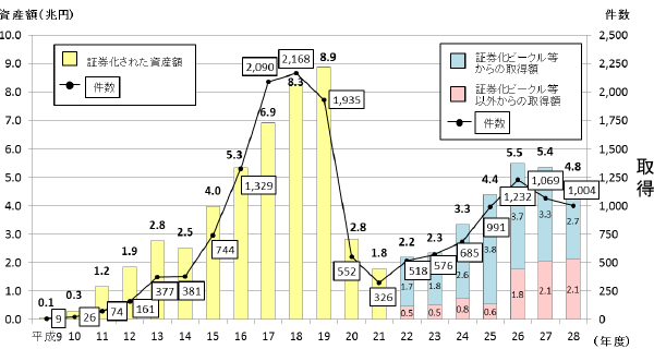 しかし、平成28年度に不動産証券化を目的に取得された不動産、または信託受益権(不動産を信託してその不動産から得られる利益を受け取る権利)の資産額は、約4.8兆円と前年度の約5.4兆円から-10.0%と、平成26年から2年連続の減少している。このうち、資産と投資家とを結ぶ機能を担うビークル等からの取得額は約2.7兆円で、証券化ビークル等が譲渡した資産額は約5.0兆円であった。(※)