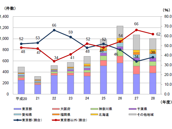 平成28年度に取得された資産を対前年比で所在地別に見てみると、東京都が382件(+21件)、大阪府が130件(▲18件)、神奈川県が79件(▲11件)、愛知県が69件(+15件)、千葉県68件(+8件)、北海道47件(+4件)、その他の地域が197件(▲73件)となっており、東京都と大阪府が全取得件数の約半分を占めている。