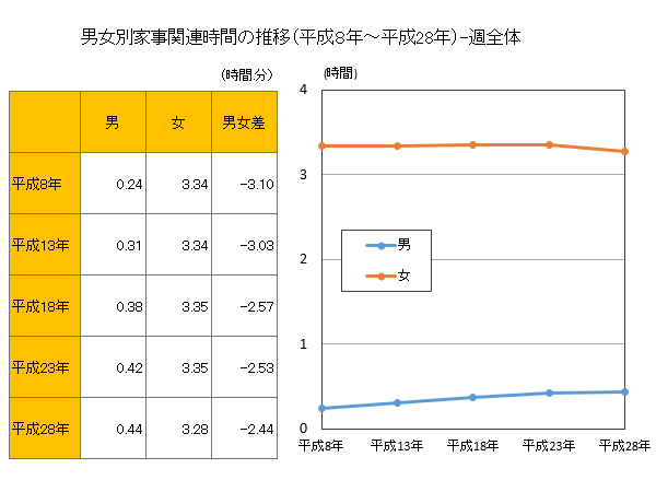 家事関連時間を男女別で見ると、男性は44分で前回調査から2分増加、女性は3時間28分で7分減少した。過去20年の推移をみると、平成8年と比較し男性は20分増加、女性は6分減少している。とは言え、男女差は2時間44分と差は大きいままだ。