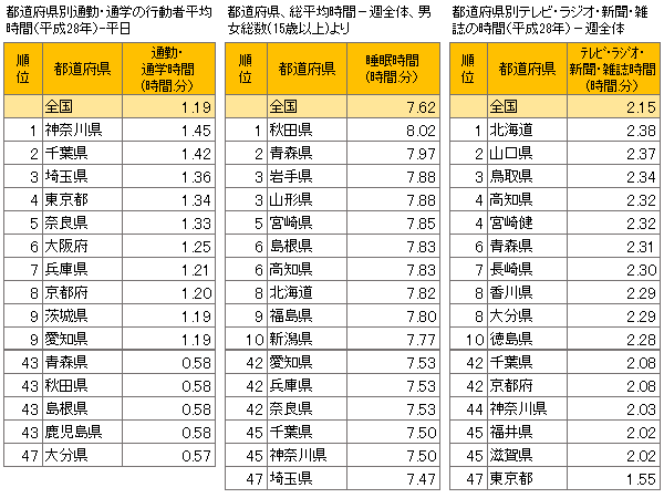 通勤・通学時間が長い神奈川県、千葉県、埼玉県は、睡眠時間が短い傾向にあるようだ。順位に多少の差はあるものの、最も睡眠時間が短い県は埼玉県で7時間47分、次いで神奈川県・千葉県と、通勤・通学時間が長い3県が該当している。最も睡眠時間が長い県は秋田県で平均8時間2分だった。(都道府県、総平均時間-週全体、男女総数(15歳以上)より)